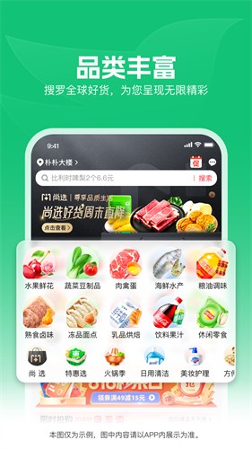 水果蔬菜、肉禽蛋奶、粮油调味、酒水饮料、休闲食品、个人护理、化妆品、清洁用品、日用百货——12大品类应有尽有,超市搬上手机,一站满足全家需求