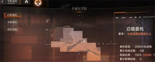 第三个板块是学院委托。同样是小队评级达到黑铁一的时候解锁。这个玩法需要消耗委托函来执行委托任务,完成之后就能获得历练经验。委托有不同的等级,等级越高给的经验越多,但是你只能接不超过自己当前评级的委托。