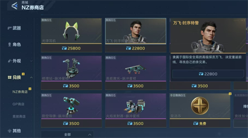 万飞时序特警为限时上架角色,获取方式明确且唯一:需通过游戏内商城的NC券商店进行购买。操作流程简洁——进入主界面后点击商城入口,在分类中定位至“NC券商店”,即可在商品列表中找到该角色图标。角色售价固定为22800点NC券,且每个账号限购一次,属于不可重复获取的限定身份。