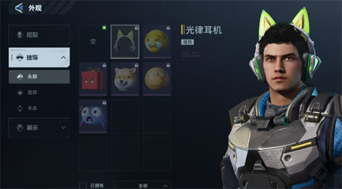 成功购入后,万飞时序特警将自动加入角色库。随后可在角色展示界面开启深度定制。头部配件提供多档风格选项:光律耳机突出硬核科技感;滑稽头套与惊讶头套则强化趣味表现力,适合娱乐向组队场景。面部组件同样具备高自由度,涵盖面甲与护目镜两大模块。