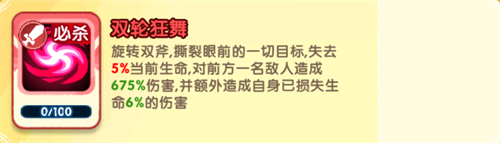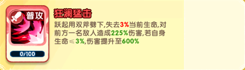 跃起用双斧劈下,失去3%当前生命,对前方一名敌人造成225%伤害,若自身生命≤3%,伤害提升至600%
