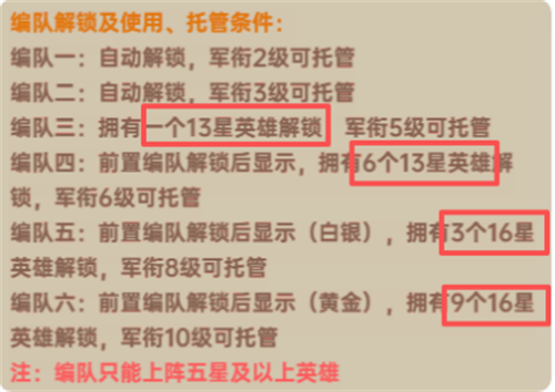 最基础的大家拥有2队编队,随着拥有的高星级英雄越多,扩展的队伍也就越多。大多情况下,优先培养6名13星英雄解锁4队→3名16星英雄解锁5队→9名16星英雄解锁6队。