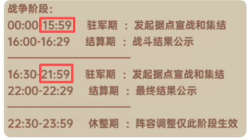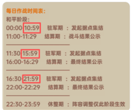 战斗时间:每日2场,最晚驻军为下午4点之前、晚上10点之前,指挥官务必记住!