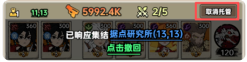 托管:如果不想太费心费力,则可以点击队伍右上角的托管按钮,指挥官就可以派遣你的队伍进驻,指挥官拥有的兵权越多,面对战场局势也更加游刃有余。