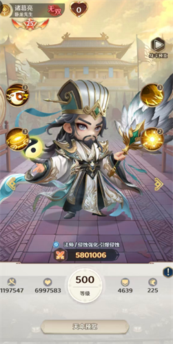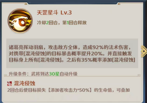 诸葛亮也被称作为卧龙先生,达到无双品质的他很是好用,在当前的法师定位当中主要依靠自身的侵蚀强化这类优势带来输出,而且他身上还有一些引爆侵蚀的能力可以用,第一个技能是天罡星斗,这个技能使用的时候可以让诸葛亮挥动自己手中的羽扇,攻击的目标是敌方全体,给全部的敌人都造成92%的法术伤害,此时如果是已经有携带了混沌侵蚀的目标,那么诸葛亮在自身的暴击概率上面后会有提升20%的数值,此时还可以直接触发目标身上所有混沌侵蚀状态,在此之后更有35%概率再一次添加混沌侵蚀,混沌侵蚀这个状态就是他主要的一个用法,一般在敌人身上生效的时候是在2回合之内都会使这个目标损失攻击力50%的生命,后期叠加起来之后绝对是非常强势的输出技能。