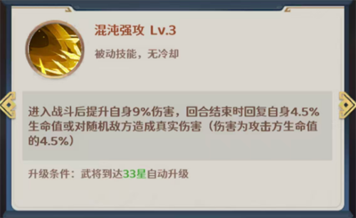 混沌强攻这个技能是进入战斗后提升诸葛亮自身9%的伤害,而在回合结束的时候,还可以回复自身4.5%生命值或对随机敌方造成真实伤害,这里的真实伤害数值是攻击方生命值的4.5%,这个技能升级条件是在武将到达33星的时候会自动升级的,所以也是从根本上就解决了法师的续航问题,另外是进入战斗的时候诸葛亮就有机会可以获得9%的增伤,这个数值虽然看起来不高,但是回合结束的时候也是有更多的灵活性可以选择,如果是诸葛亮自己血量健康的话,这里可以选择对随机敌人造成生命值4.5%的真实伤害,如果是对坦克类型的敌人用还是很好的,另外如果是在残血状态当中的话,这里4.5%的回血又能保证诸葛亮的生存效果不受影响,所以诸葛亮其实是不算占用治疗位的,如果是他带队的话容错率也会更高。