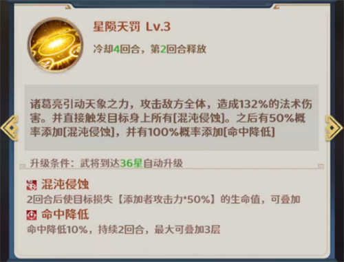 另外的星陨天罚这个技能是冷却达到4回合才可以再一次使用的,使用时诸葛亮依旧会攻击敌方全体,造成132%的法术伤害,此时还可以直接触发目标身上所有混沌侵蚀,之后有50%概率添加更多层的混沌侵蚀,并在此时有100%概率添加命中降低的能力,命中降低的这个状态会让敌人在命中数值上面降低10%,然后最大可叠加3层,而且每当敌方触发混沌侵蚀的时候,都可以立即为最低血量队友恢复11%攻击的生命值,这个机制一般在被对面盯的比较紧,且此时也处于高压环境下的话,也是相当好用的,15%的概率可以附加的混沌庇护让诸葛亮在上面有6%的三抗加成,所以就算是在在八回合的战斗中,他的被动触发几率也会更大一些。