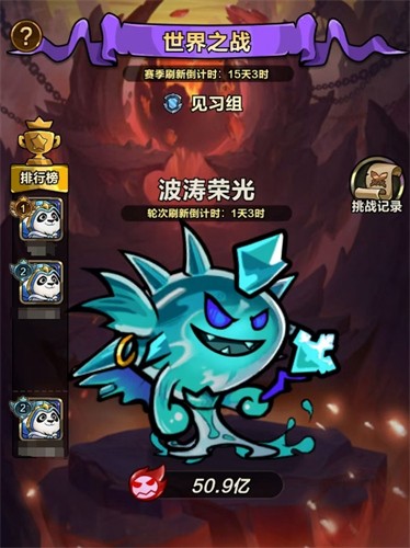 世界之战是以赛季制的形式展开的挑战玩法,每天能进行2次挑战,一个赛季共有4轮,一轮各7天。它会让玩家们直面一位强大的boss,但玩家的目标并非是击败boss,而是尽可能地在boss面前生存下去,只要玩家能坚持到关卡结束,便能拿完全部的奖励。当然,游戏也会记录玩家对boss的输出伤害,并会为玩家们进行排名,每轮为一个周期,且本轮打完后,会根据玩家排名发放奖励,且会在下赛季开始时,参考玩家上赛季的组内排名重新分组。