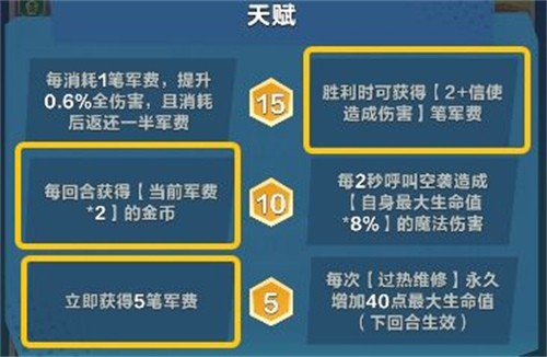 依赖经济和橙卡量碾压的中后期强势玩法,前期连败迅速攒军费,以最快速度解锁10级天赋增加每回合经济,攒满军费后开启1次军备,同时中期边随机技能边寻找能增加战力的生命、中毒、守卫、易伤等流派,利用此时的金卡和经济优势稳住血量防止迅速被淘汰。到了后期就可以通过经济和金卡优势滚雪球逐渐扩大优势。15级天赋根据自身战力去选择,战力低的可以选择放弃未来获得全伤害增强,战力高的可以继续胜利获得更多军费积攒更多经济。