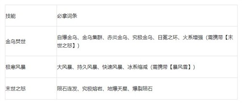 搭配说明:【金乌焚世】首充即可获得,技能使用时覆盖范围可观,搭配【金乌集群】增加金乌数量后,几乎能覆盖近半屏,再结合【极寒风暴】的冰冻效果,能显著提高推关效率。【末世之怒】、【暴风雪】除了能为玩家补足伤害外,也是激活【火系增强】和【冰系缩减】的必要挂件。