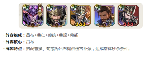 强攻追击队核心就在于吕布可以把曹仁放在前面抵抗伤害,曹操和荀彧这两个就能起到辅助的效果,然后搭配庞统就能发挥联动的作用。直接把吕布的爆发拉满,在团战的过程中就可以轻松的达成群体秒杀,确实速战速决。