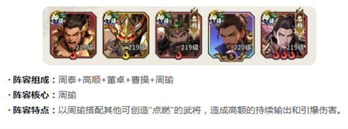 火神降世队必须要安排,主要的核心就是周瑜。另外里面还有周泰,董卓以及高顺。一方面可以抵抗伤害,同时也可以配合周瑜去创造点燃的效果,在层层灼烧叠满之后就可以触发引爆。