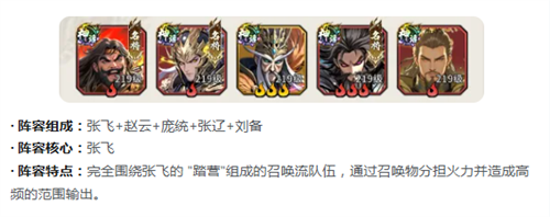 煞影重重队确实会有一些独特,主要是围绕张飞的技能搭建。赵云还有张辽就可以打突进,庞统就可以补联动,刘备主要是补充血量。张飞的召唤物可以分担敌方的火力,又可以打出高频的范围性输出。靠着召唤物的优势,就能轻松的压制敌方的脆皮阵容。