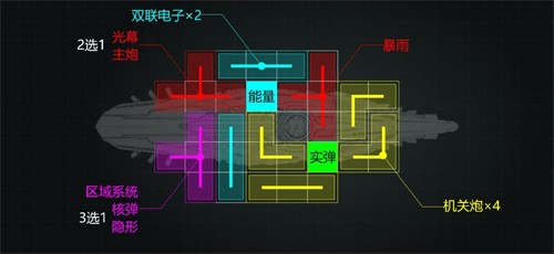 普攻选用的机关炮是本游cd最短的武器。确保不会出现超过10秒没叠层导致buff消失的现象。负面效果就是有点轻微卡炮口,所以另外两把吃能量加成的选择了CD最长的双联电子。加上此船基本以近战为主,双联电子还能降低敌人攻击力,延长自身存活时间。