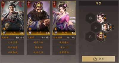 2、貂蝉兵种务必选择羽林骁骑,增大貂蝉被攻击的几率。貂蝉受到伤害时有概率让吕布插队发动自带战法,反手团灭敌方,独特的“插队”机制使吕布无需抢占先机也能后发制人。
